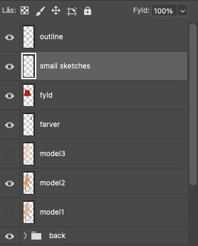 I’m always arranging my layers like shown in this picture. The outline is on top, while “fyld”, which translates to “fill”, is the lowest. I create another layer in between called “small sketches” and I use my “sketch brush” or “hard + gradient” brush to draw folds and other details that need marking.